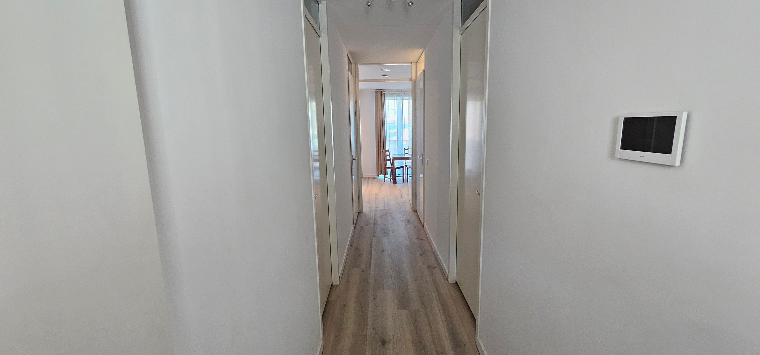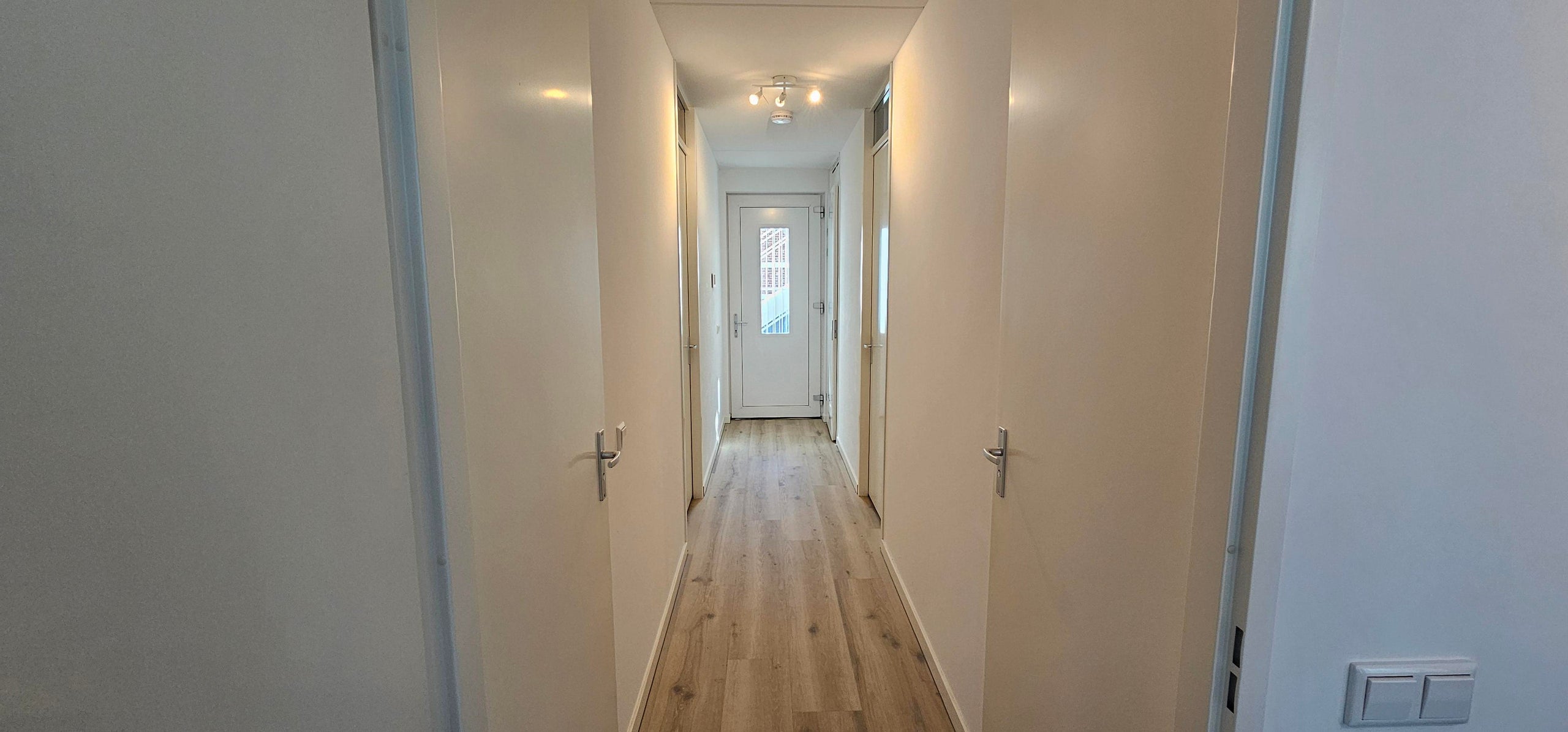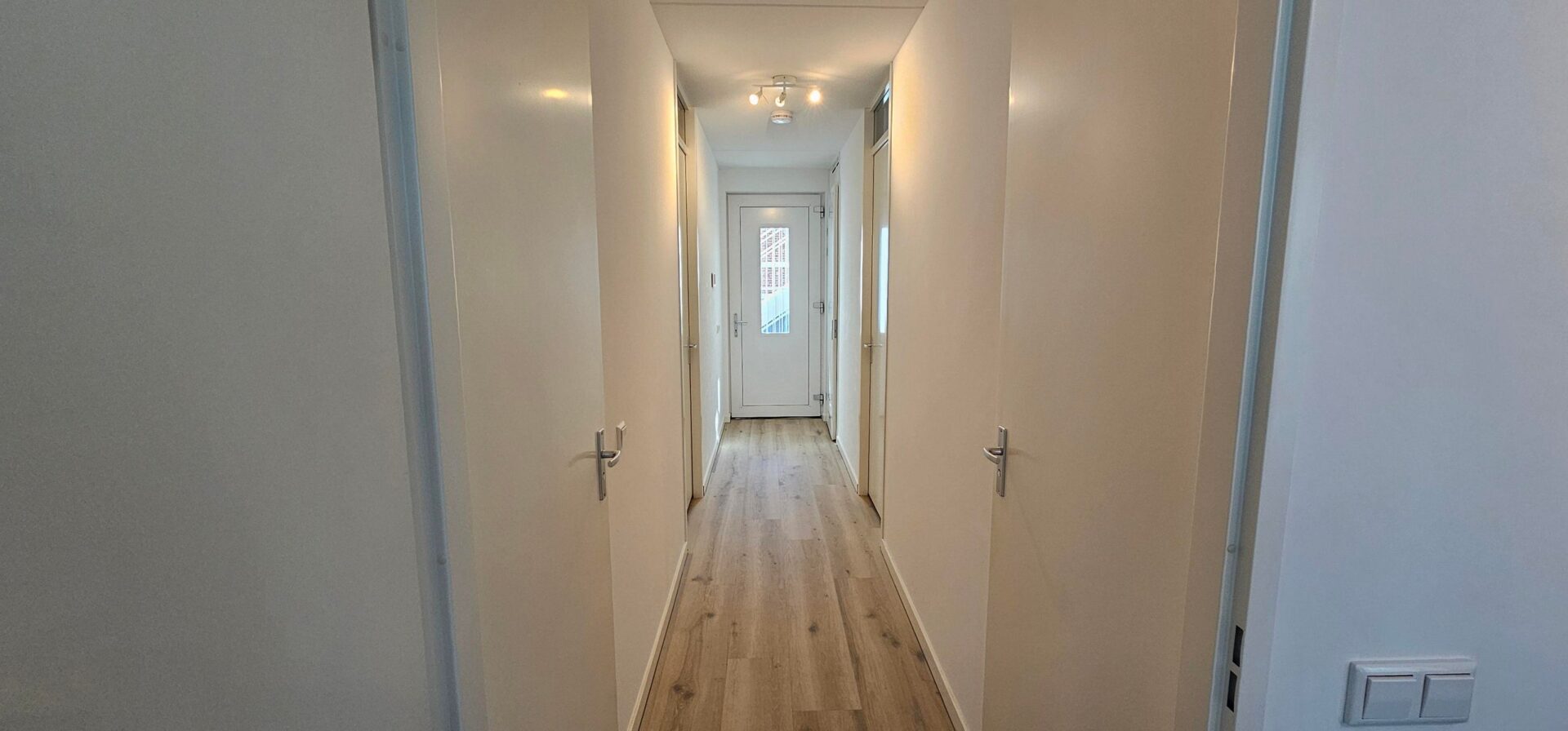 Binnenkomst in de hal, waar aan de voorzijde twee slaapkamers van goed formaat zijn gelegen. Aan de linkerzijde bevindt zich de moderne badkamer met wastafel en ruime douche. Rechts van de hal is een separaat toilet. Door de gehele woning ligt een lichte, stijlvolle PVC-vloer.