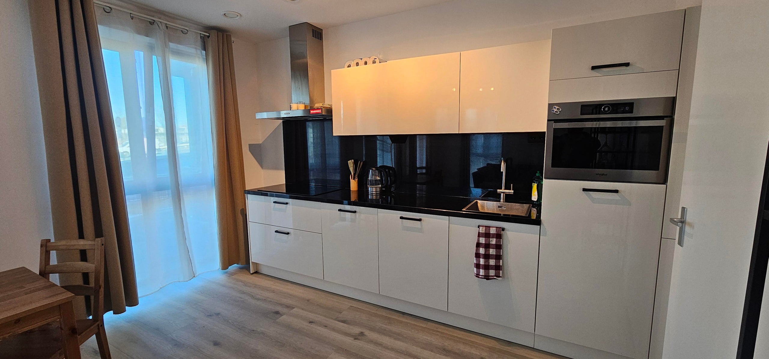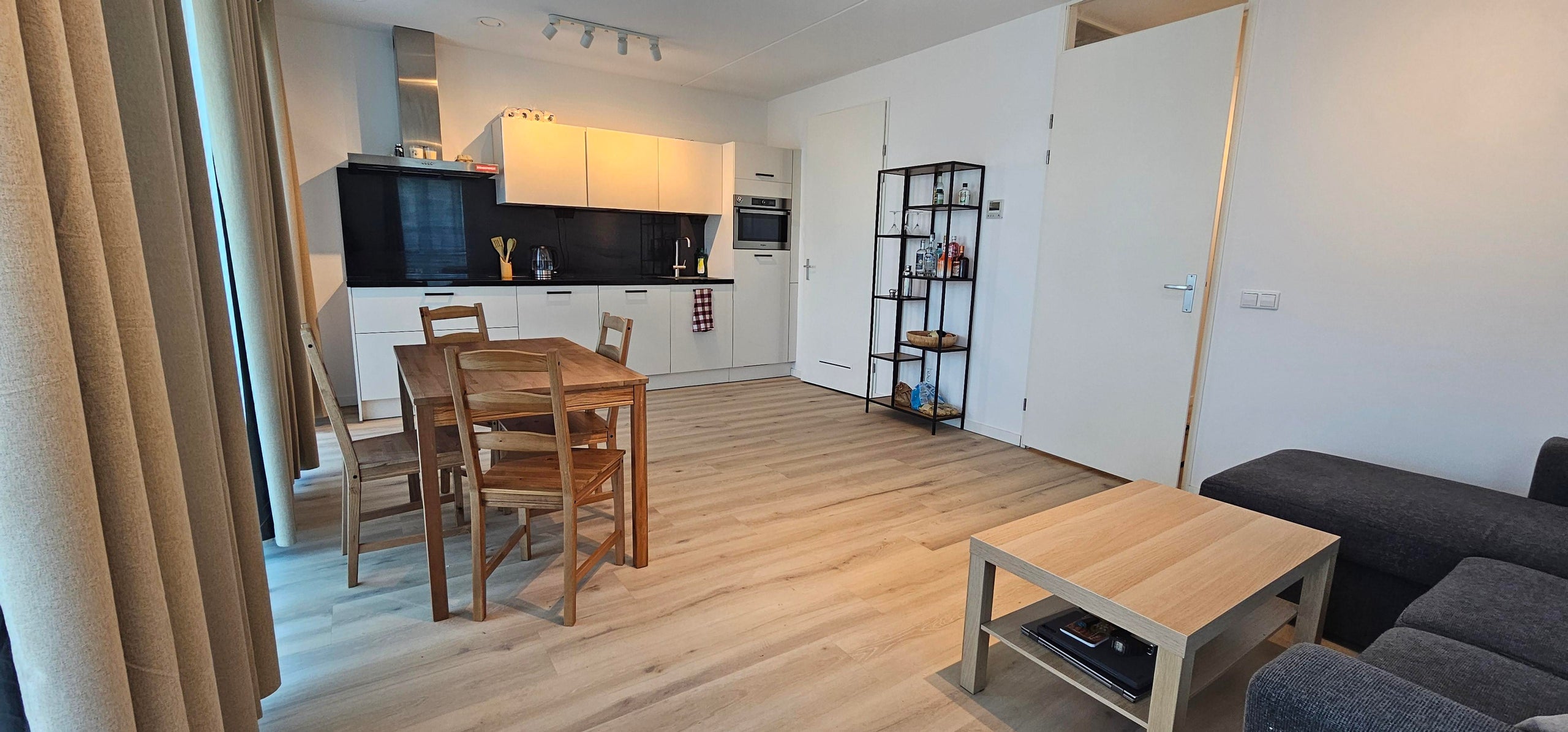 De royale en lichte woonkamer wordt gekenmerkt door grote raampartijen die zorgen voor een overvloed aan natuurlijk licht. De open keuken is modern ingericht en voorzien van diverse inbouwapparatuur, waaronder een inductiekookplaat, wasemkap, vaatwasser, combi-oven/magnetron en een koel-/vriescombinatie.