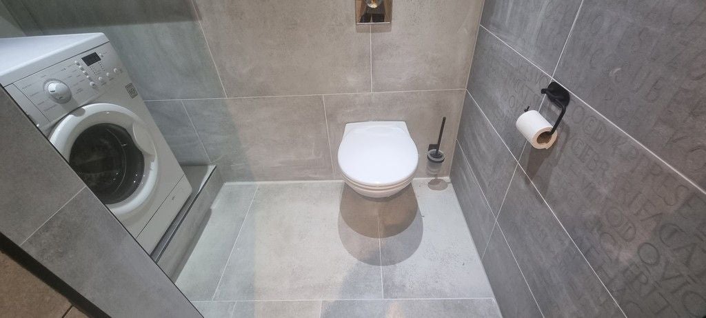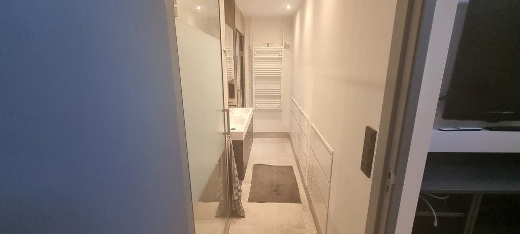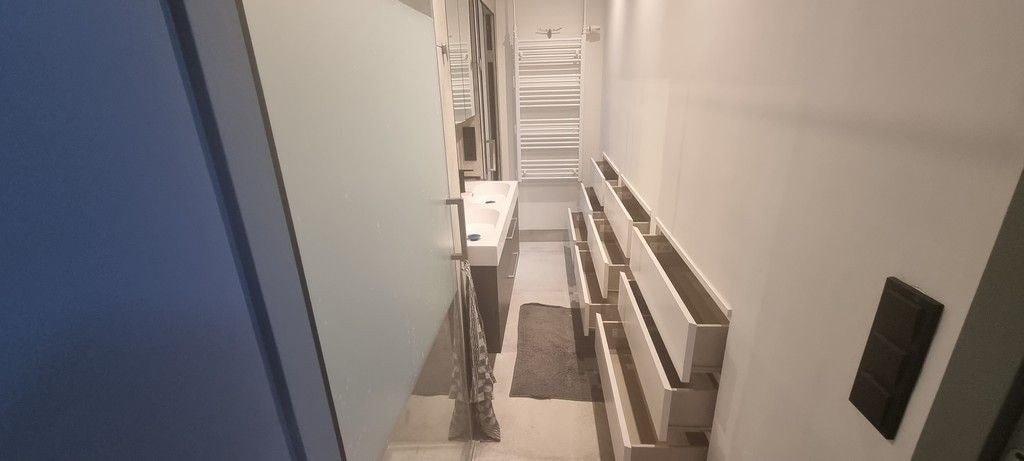 Gang met douchecabine, dubbele wastafel met ombouw, separaat toilet en wasmachine opstelling. In de gang veel bergmogelijkheden door middel van diverse lades.