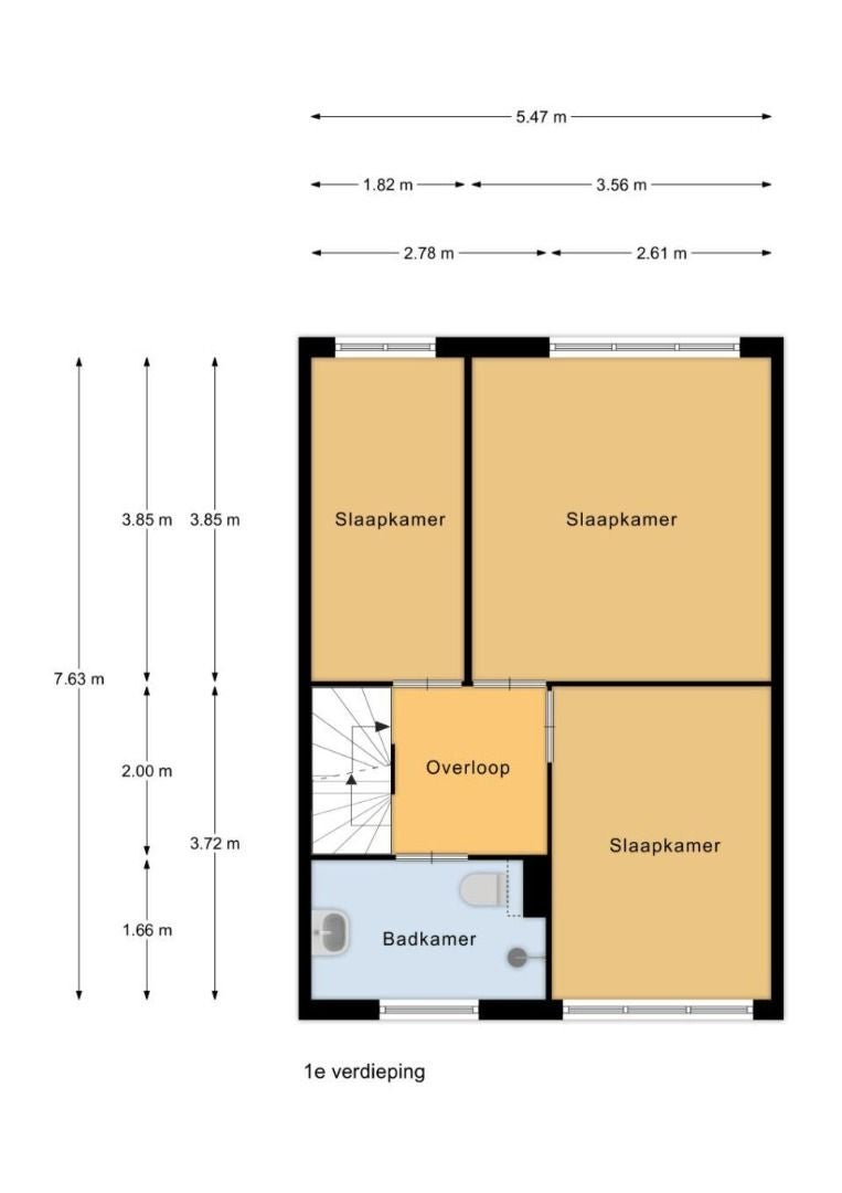 De eerste verdieping beschikt over drie slaapkamers en de badkamer.
