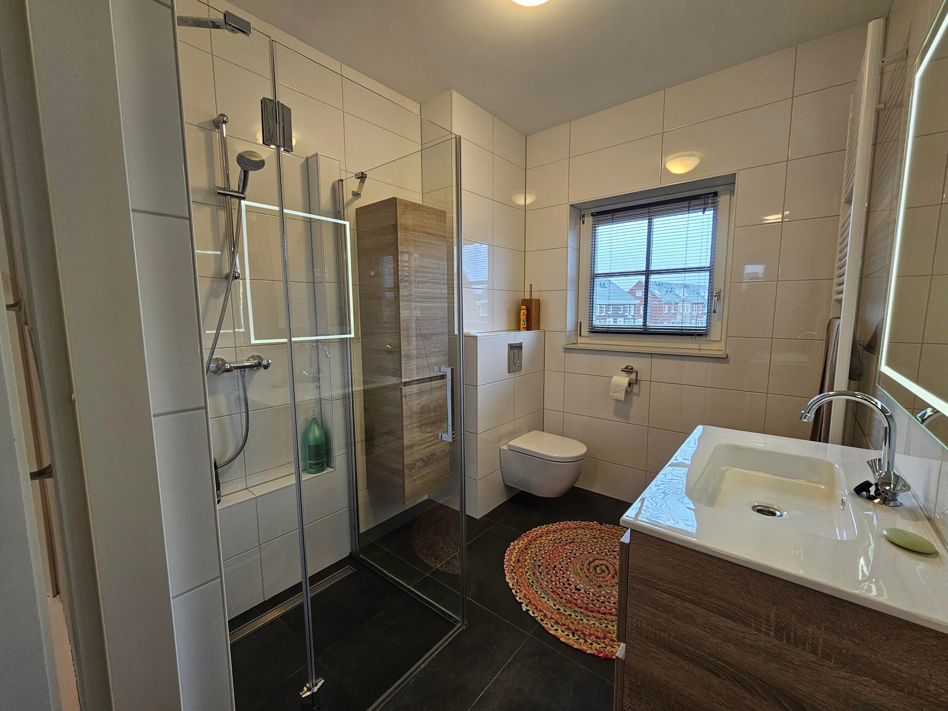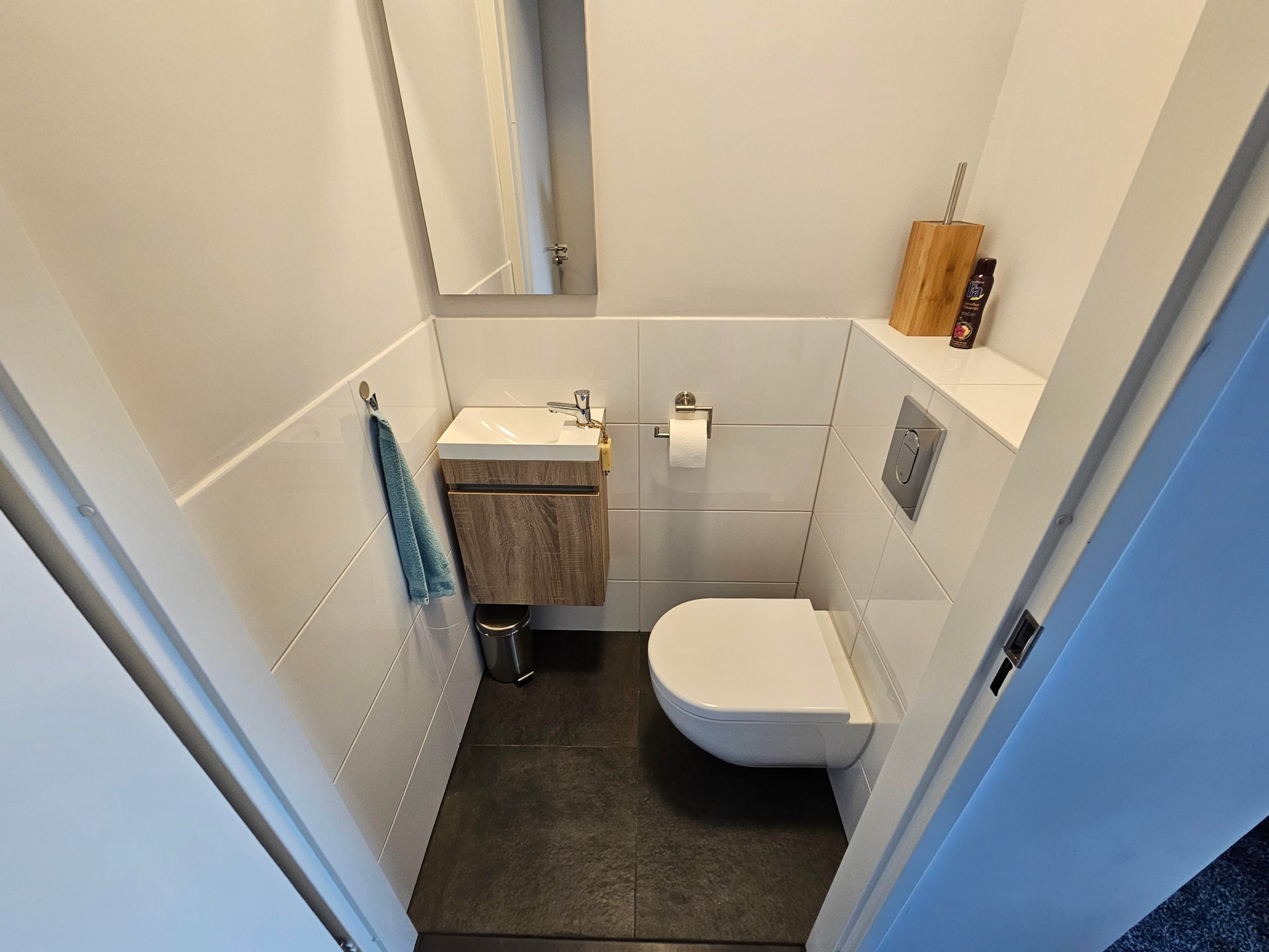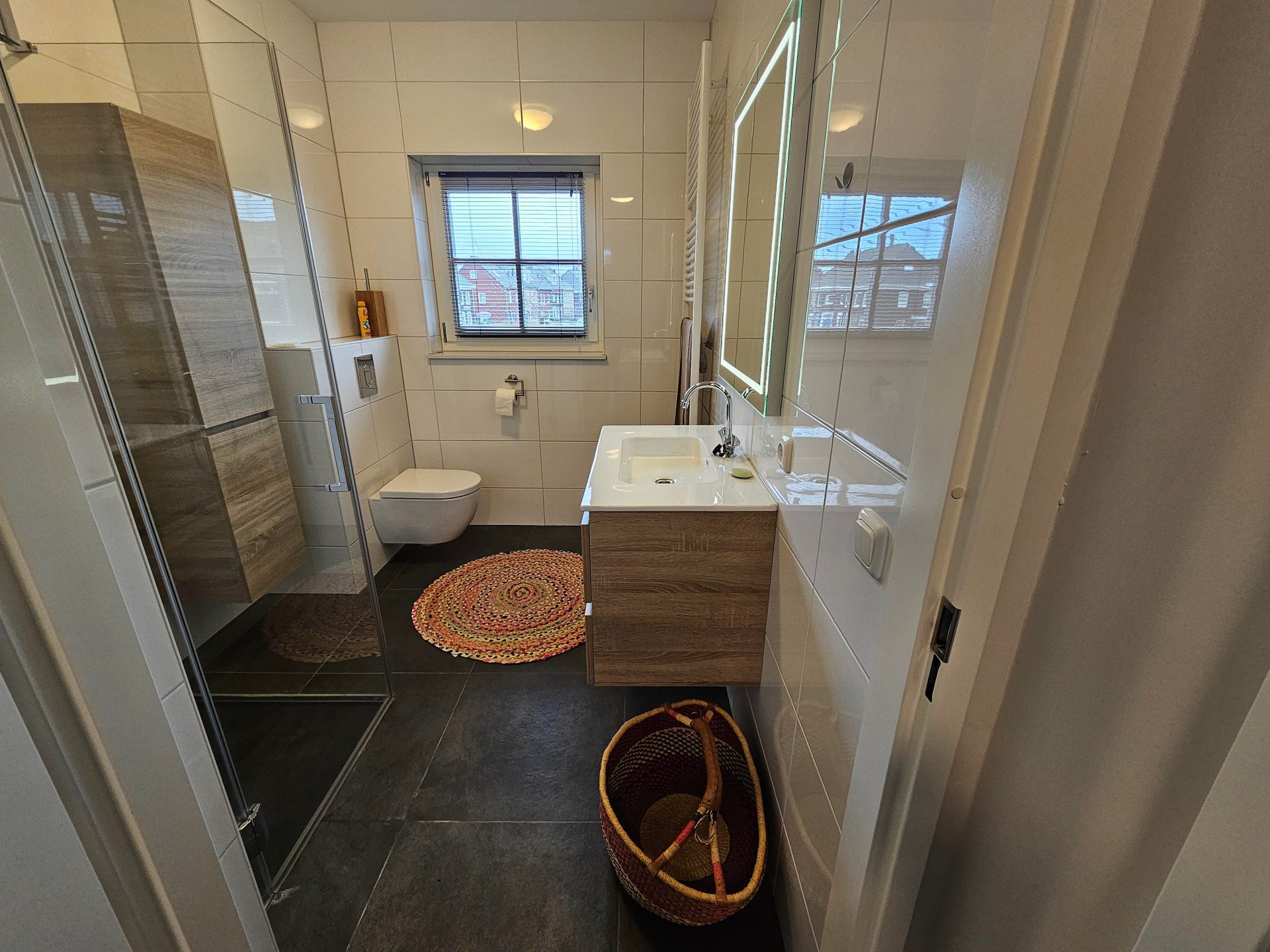 1e etage: 2 ruime slaapkamers en een inloopkast (voormalige slaapkamer), badkamer met douche, wastafel en 2e toilet.