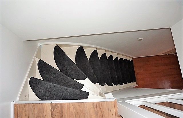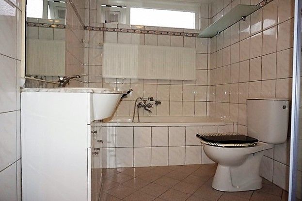 1e verdieping: Overloop, badkamer met ligbad, separate douchecabine, wastafelmeubel met marmerblad, tweede toilet. Slaapkamer van c. a.14 m2 met vaste kastenwand en laminaatvloer. Tweede slaapkamer van c. a.11 m2 met vaste kastenwand en laminaatvloer plus openslaande deur naar het kleine balkon op het zuidoosten. Er is een separate ruimte met wasmachine/droger opstelling. en de vaste trap naar de 2e etage