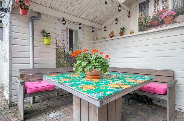 Vanuit de keuken toegang naar de tuin van c. a 30 m2 met houten berging en gezellige overkapping.