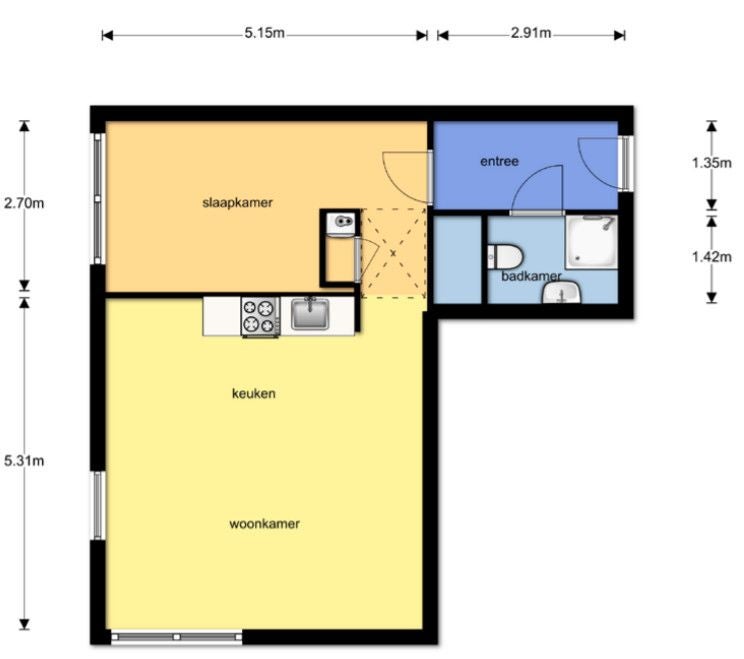 10 etage: Entree, gang, badkamer met douche, wastafel en toilet, slaapkamer, woonkamer met openkeuken voorzien van vaatwasser,, combimagnetron, koelvriescombinatie en wasmachine.