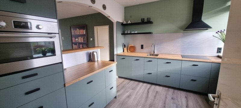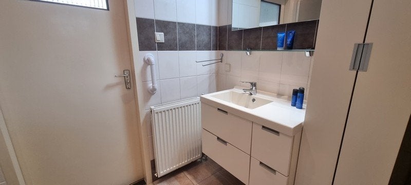 Entree: hal, toilet. Gezellig ingerichte knusse woonkamer met half open nieuwe keuken v.v. diverse nieuwe inbouw apparatuur o.a. vaatwasser, koel/vries combi, inductiekookplaat, combi oven/magnetron. Ook alle keukengerei is aanwezig. Naast de woonkamer een werkkamer, vanuit de werkkamer toegang tot de badkamer met douchecabine en wastafel met ombouw. Vanuit de badkamer kunt u ook, middels een tussendeur, het toilet in de hal weer bereiken.